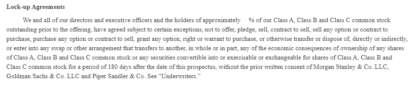 We and all of our directors and executive officers and the holders of approximately % of our Class A, Class B and Class C common stock outstanding prior to the offering, have agreed subject to certain exceptions, not to offer, pledge, sell, contract to sell, sell any option or contract to purchase, purchase any option or contract to sell, grant any option, right or warrant to purchase, or otherwise transfer or dispose of, directly or indirectly, or enter into any swap or other arrangement that transfers to another, in whole or in part, any of the economic consequences of ownership of any shares of Class A, Class B and Class C common stock or any securities convertible into or exercisable or exchangeable for shares of Class A, Class B and Class C common stock for a period of 180 days after the date of this prospectus, without the prior written consent of Morgan Stanley & Co. LLC, Goldman Sachs & Co. LLC and Piper Sandler & Co. See “Underwriters.”
