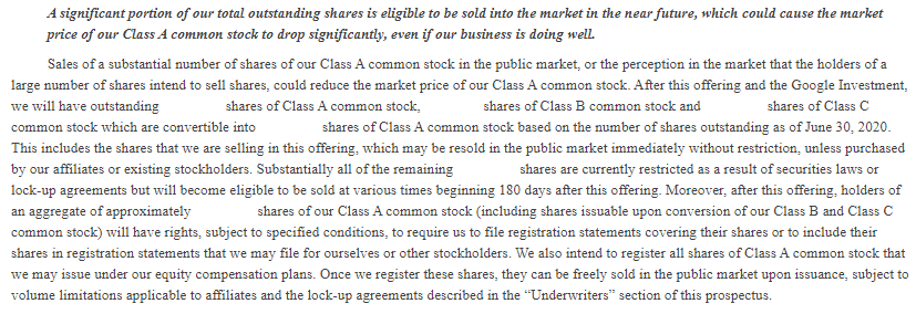Sales of a substantial number of shares of our Class A common stock in the public market, or the perception in the market that the holders of a large number of shares intend to sell shares, could reduce the market price of our Class A common stock. After this offering and the Google Investment, we will have outstanding shares of Class A common stock, shares of Class B common stock and shares of Class C common stock which are convertible into shares of Class A common stock based on the number of shares outstanding as of June 30, 2020. This includes the shares that we are selling in this offering, which may be resold in the public market immediately without restriction, unless purchased by our affiliates or existing stockholders. Substantially all of the remaining shares are currently restricted as a result of securities laws or lock-up agreements but will become eligible to be sold at various times beginning 180 days after this offering. Moreover, after this offering, holders of an aggregate of approximately shares of our Class A common stock (including shares issuable upon conversion of our Class B and Class C common stock) will have rights, subject to specified conditions, to require us to file registration statements covering their shares or to include their shares in registration statements that we may file for ourselves or other stockholders. We also intend to register all shares of Class A common stock that we may issue under our equity compensation plans. Once we register these shares, they can be freely sold in the public market upon issuance, subject to volume limitations applicable to affiliates and the lock-up agreements described in the “Underwriters” section of this prospectus.